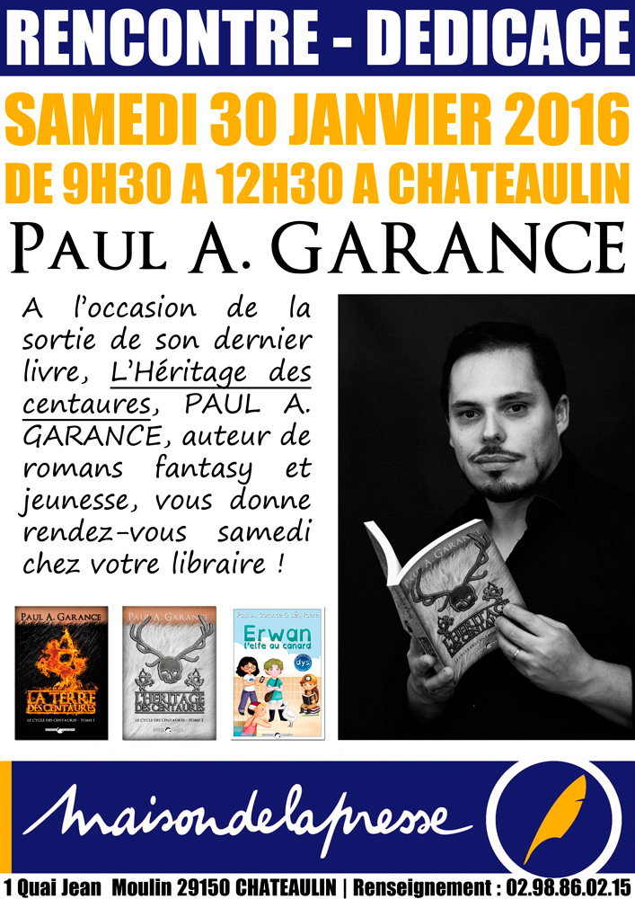 Séance de dédicaces à la Maison de la presse, à Châteaulin, samedi 30 janvier de 9h30 à 12h30.
